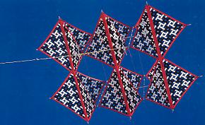 Auch die Drachen von Willy Koch aus Eupen erkennen selbst Drachenlaien auf den ersten Blick. Willy fertigt seine Drachen so gut wie immer aus Segeln an, die aus webartig miteinander vernähten Streifen bestehen.