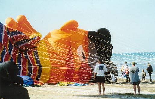 .... ist Bert bereits in der Luft. Diese Drachen der Cuxhavener Drachen-Truppe um Sven Weidhase sind sehr aufwendige Objekte. Bert ist z.B. 23 Meter hoch. Für seinen Bau gingen 560 Quadratmeter Tuch