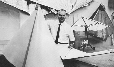 Also zu einer Zeit, in der Flugzeuge mit starrem Flügel schon seit gut 50 Jahren existierten! Seine Entwicklungen erwiesen sich später als bahnbrechend für die sichere Landung zurückkehrender Raumkapseln. Und ebenso bahnbrechend für die Sportart Hangliding. Das Foto zeigt Rogallo bei einer Präsentation seiner flexiblen Tragflächen.